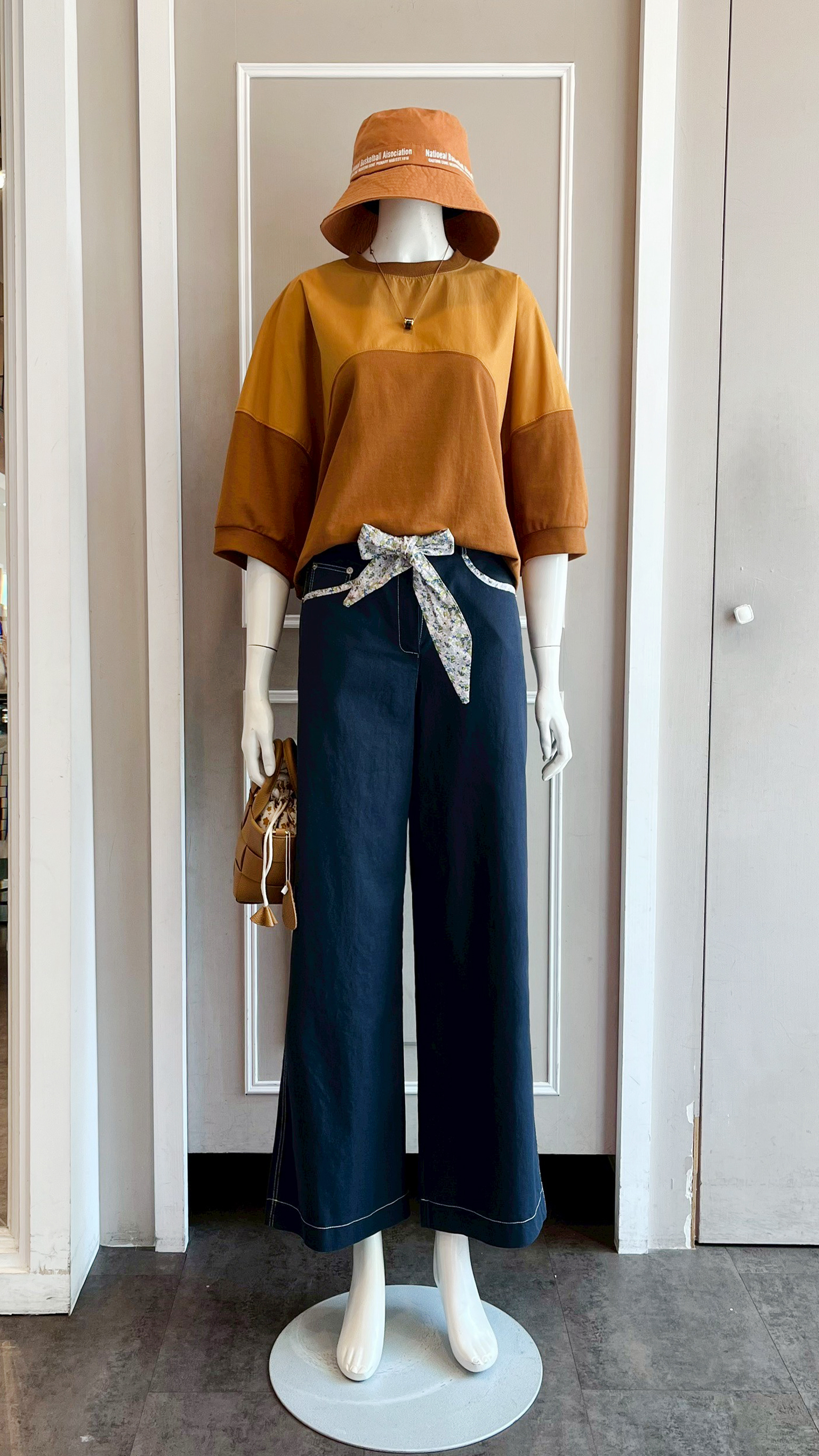 (衣) 弧形配色剪接衣 / (褲) 印花腰帶寬褲