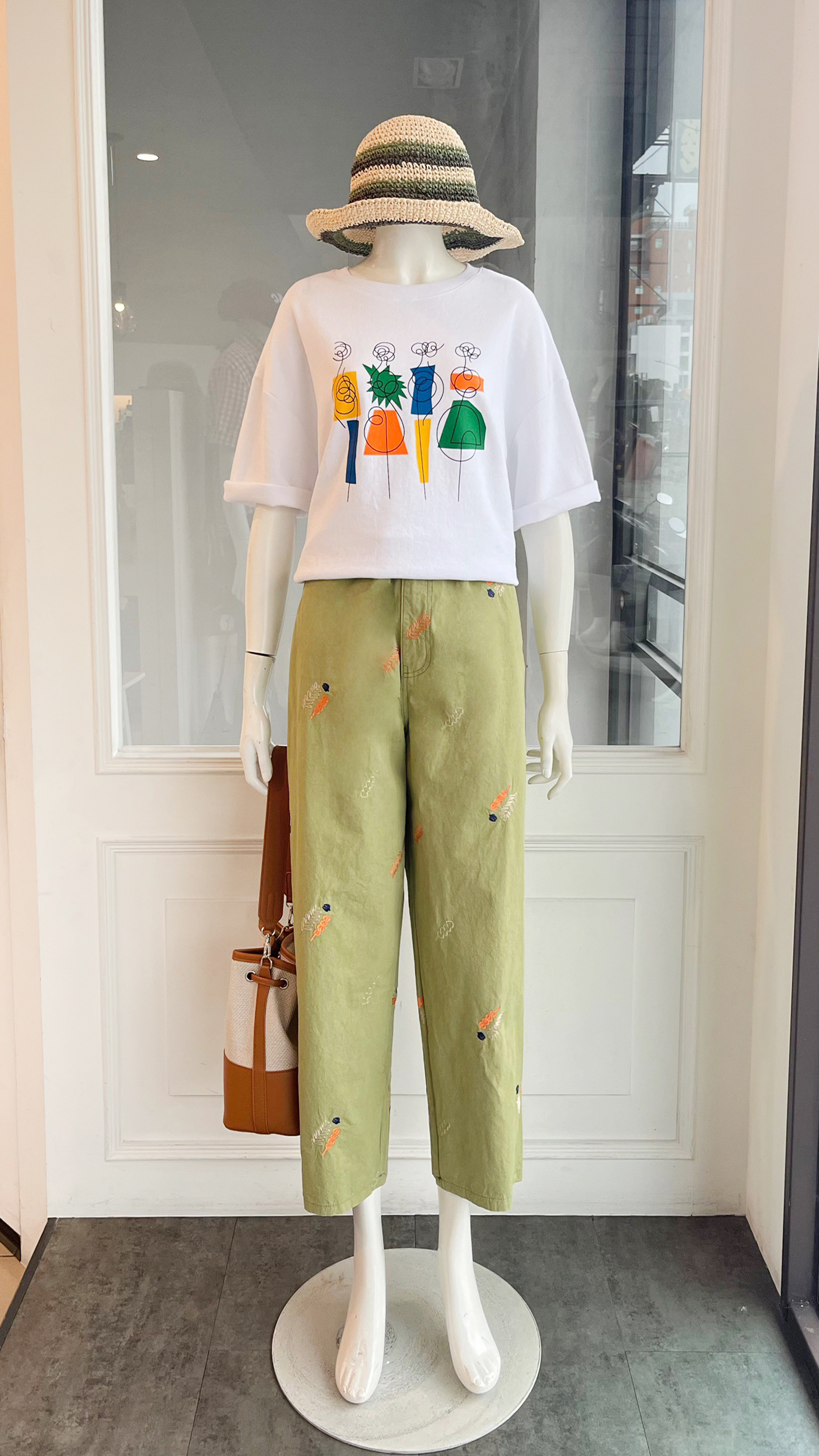 (衣) 描繪色款圖T / (褲) 一釦刺繡休閒褲