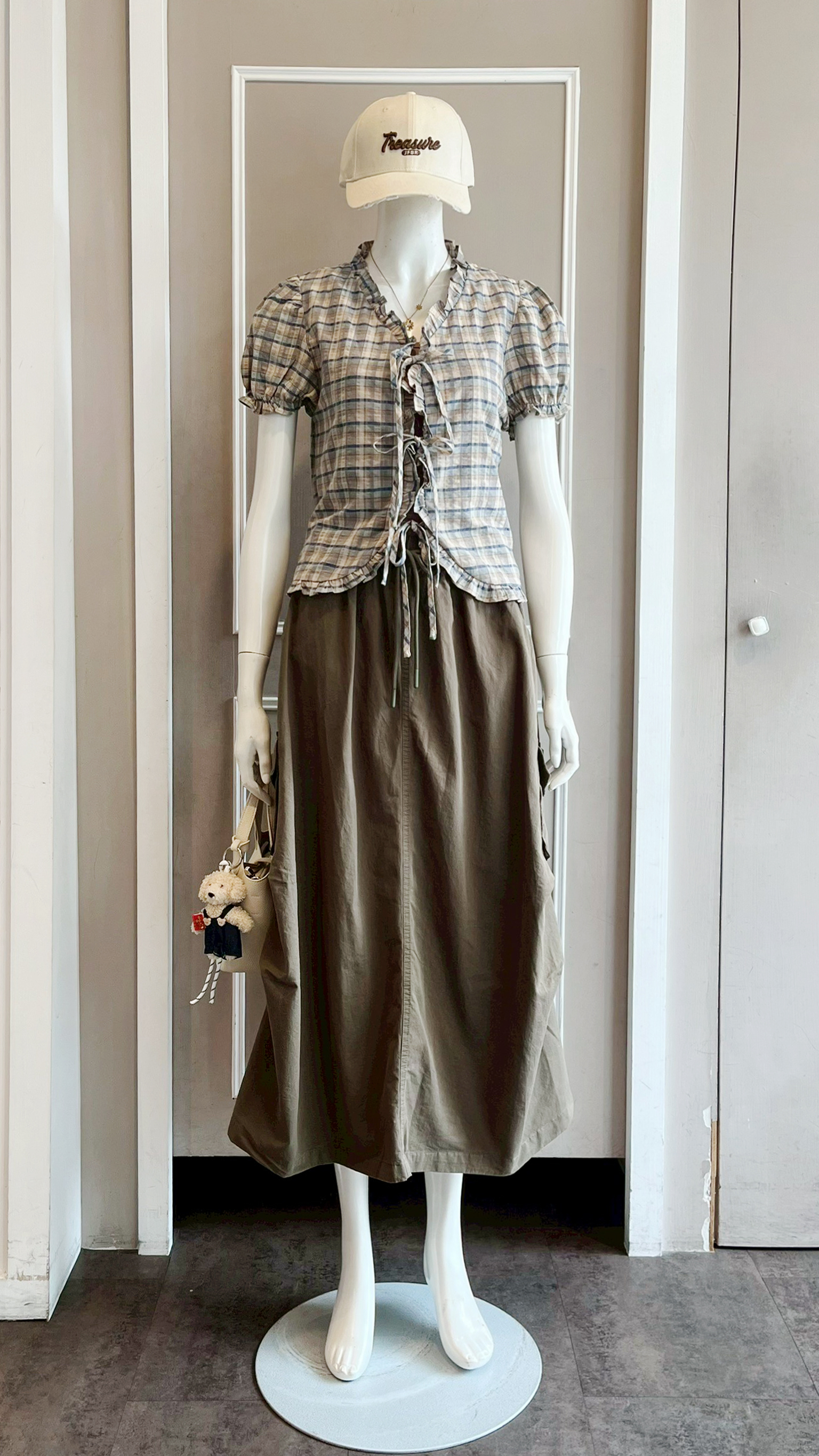 (衣) 荷葉邊格紋綁結衫 / (裙) 蓋袋裙