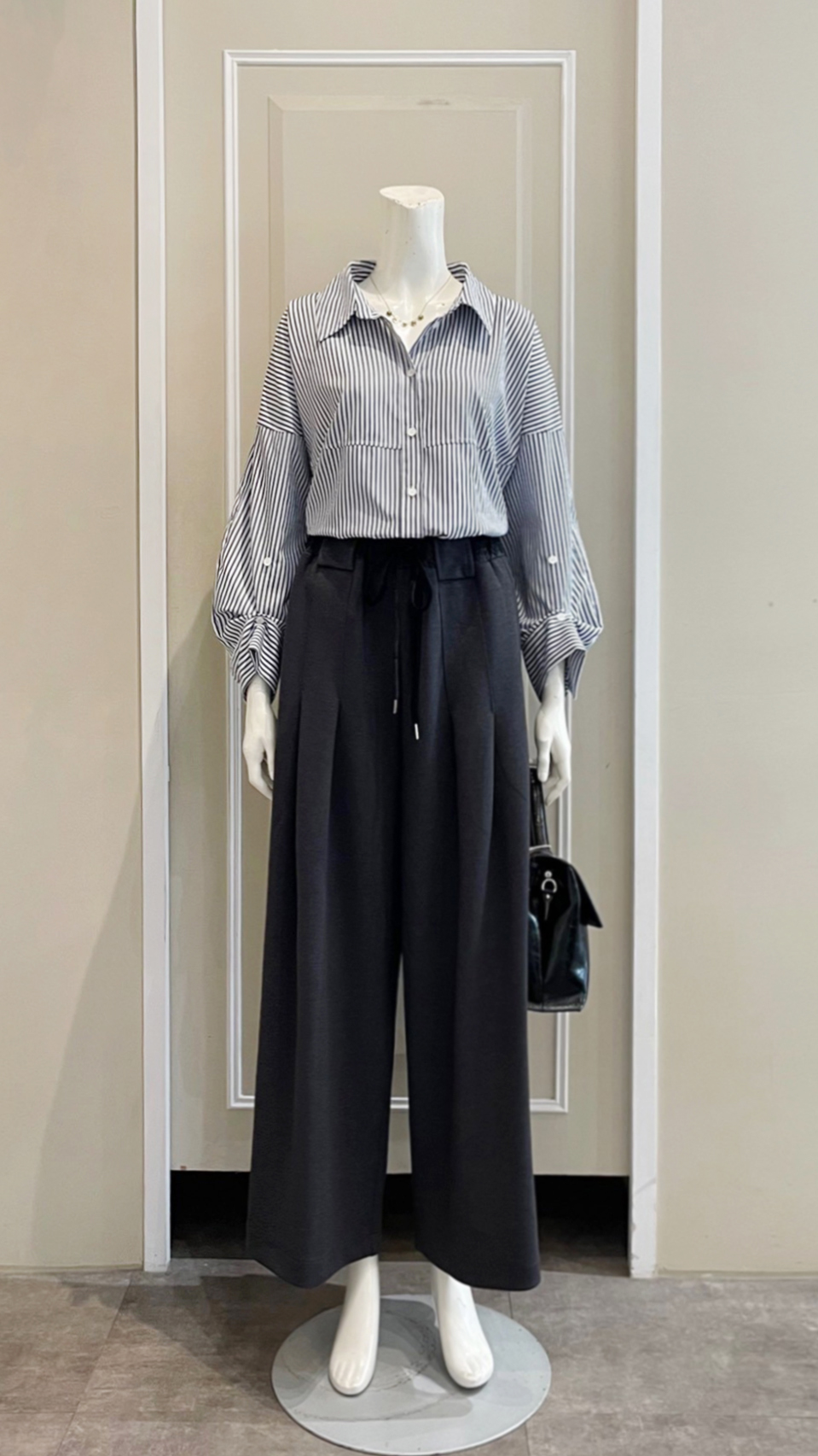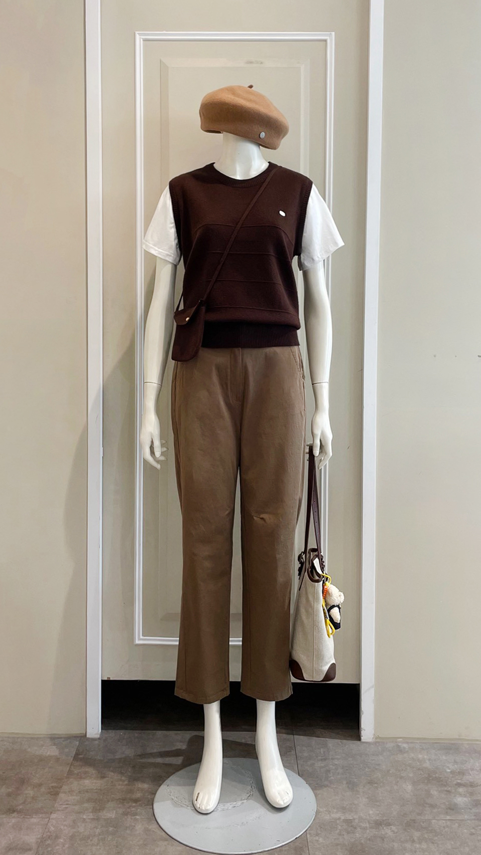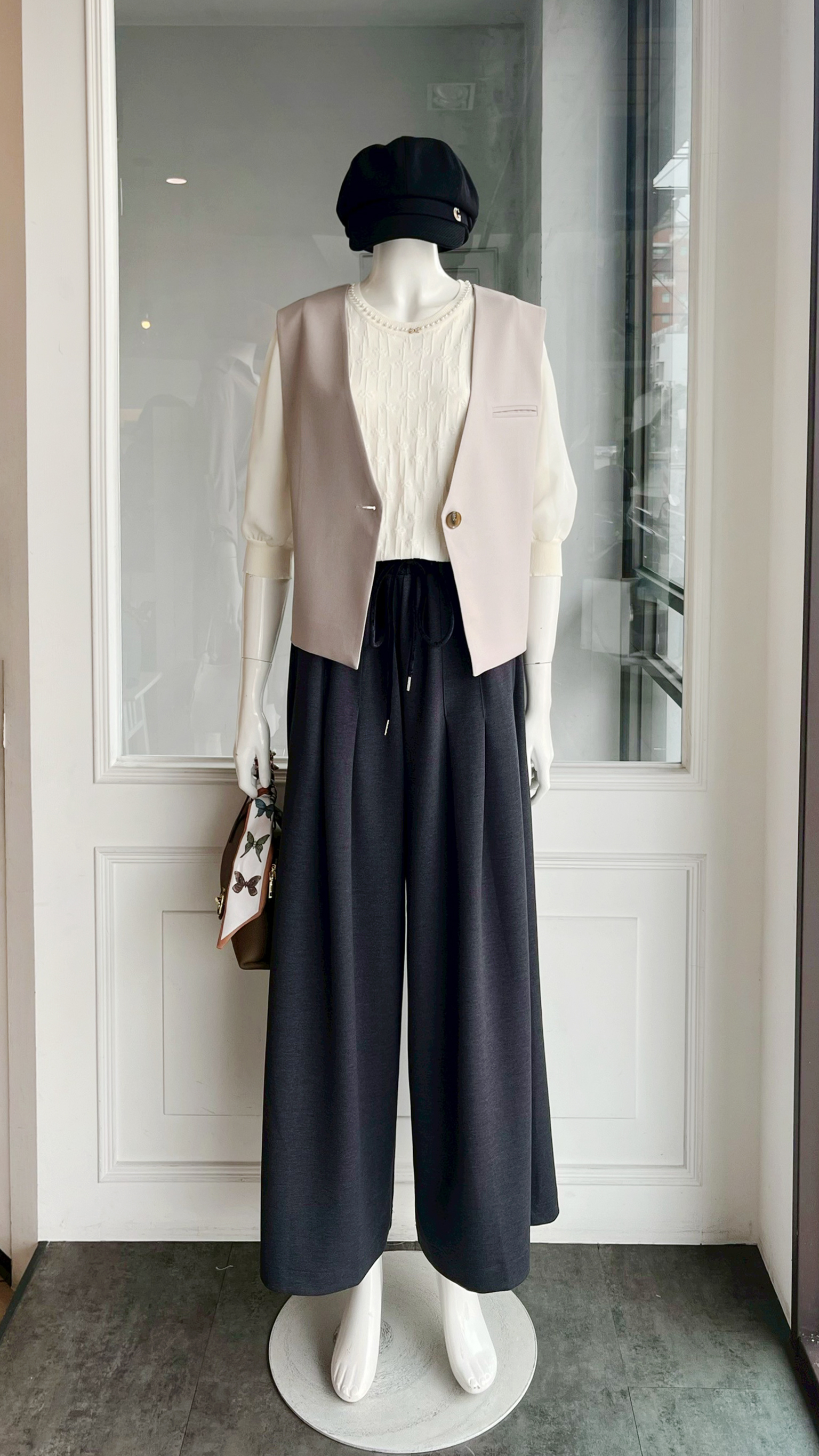 (衣) 假袖針背衣 / (褲) 英倫斜袋休閒褲