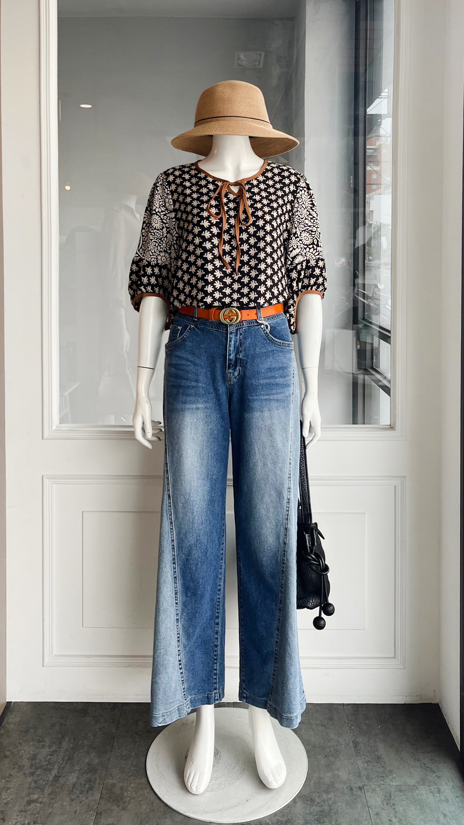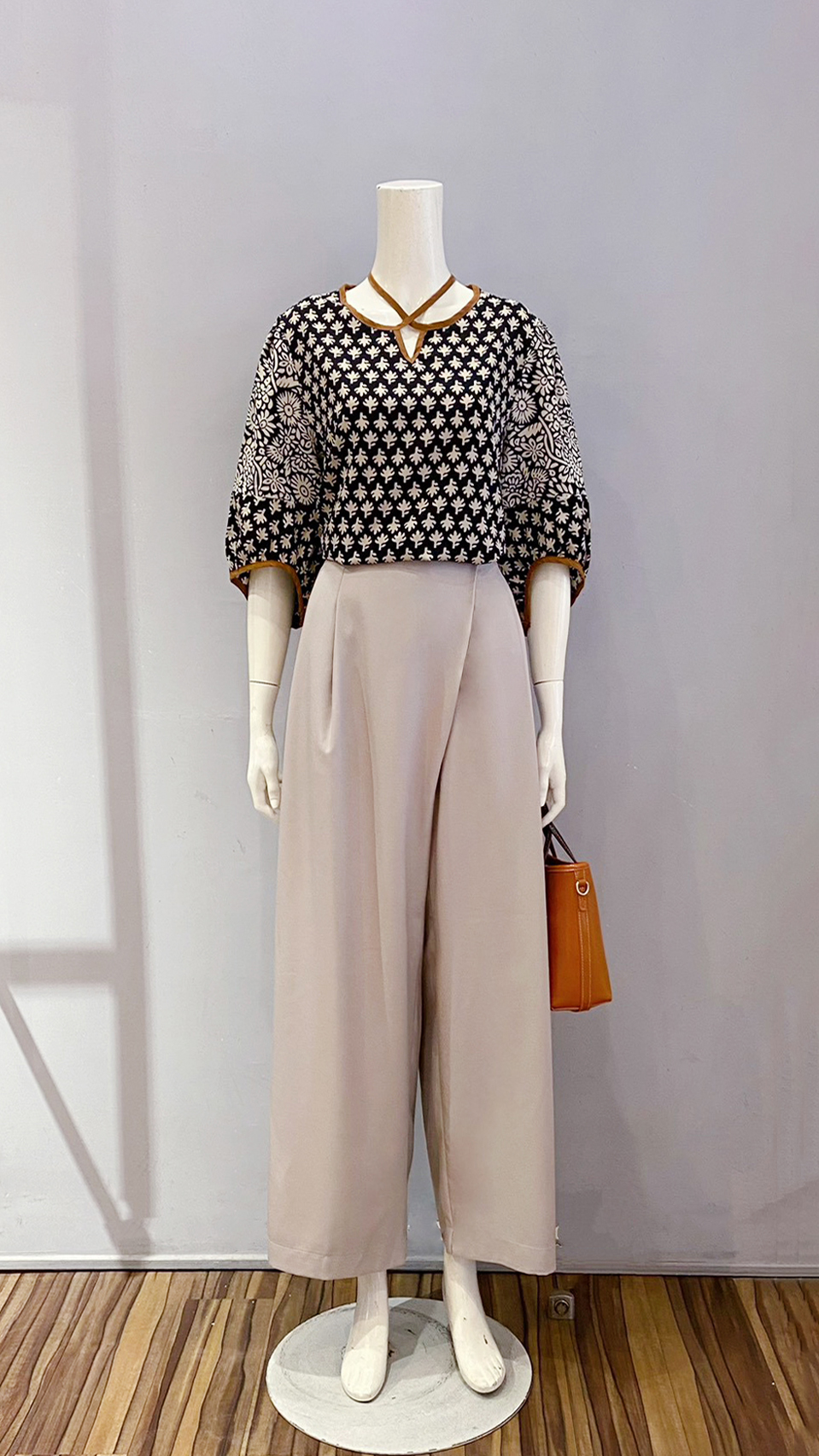 (衣) 圖騰燈籠袖衣 / (褲) 拼接牛寬褲
