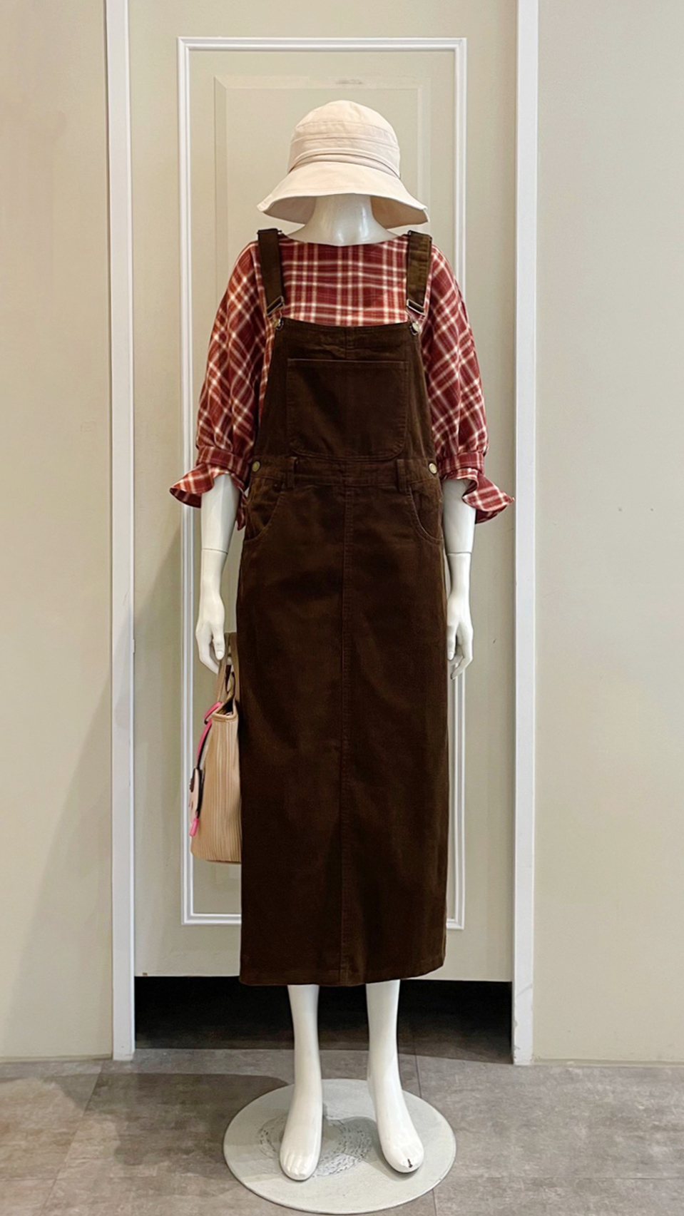 (衣) 荷葉袖格紋衣 / (洋) 工裝風吊帶裙