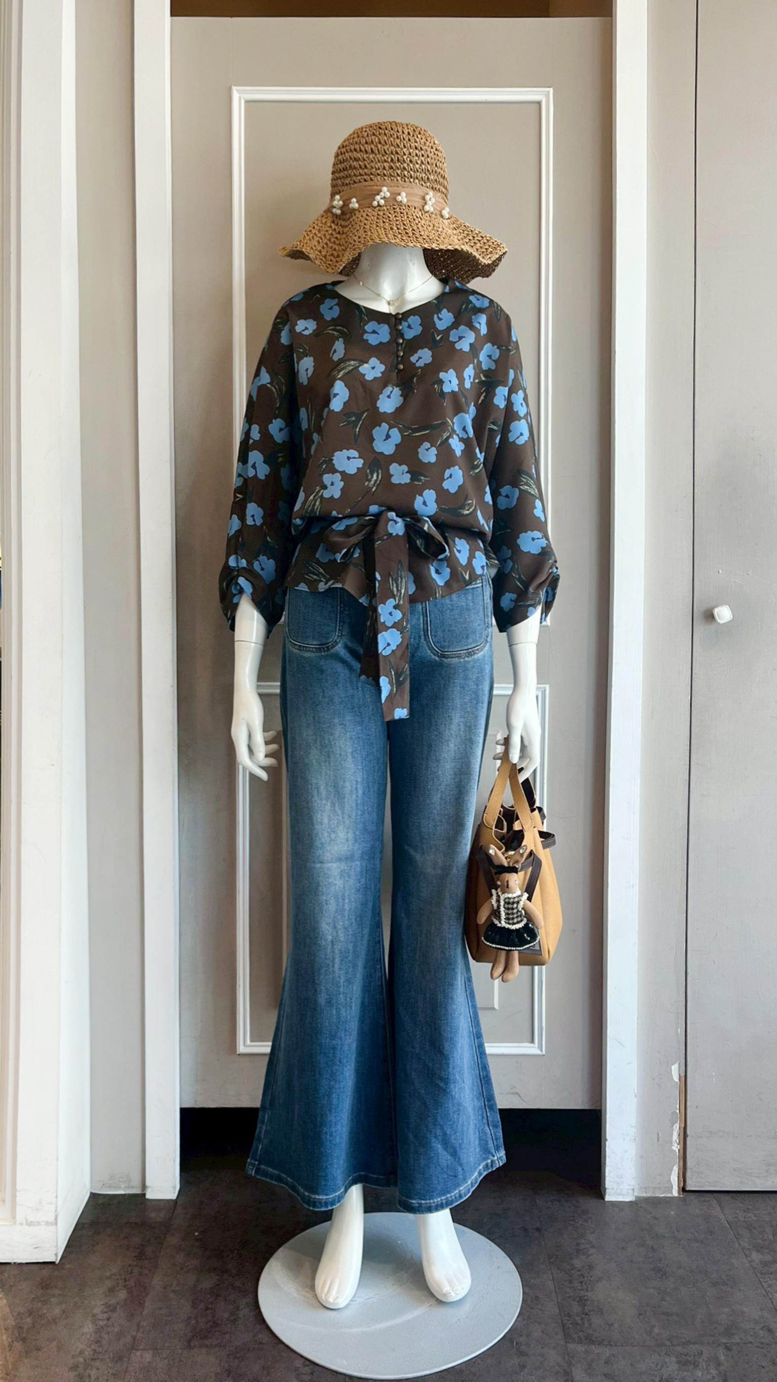(衣) 藍花綁帶衣 / (褲) 雙釦修身喇叭褲