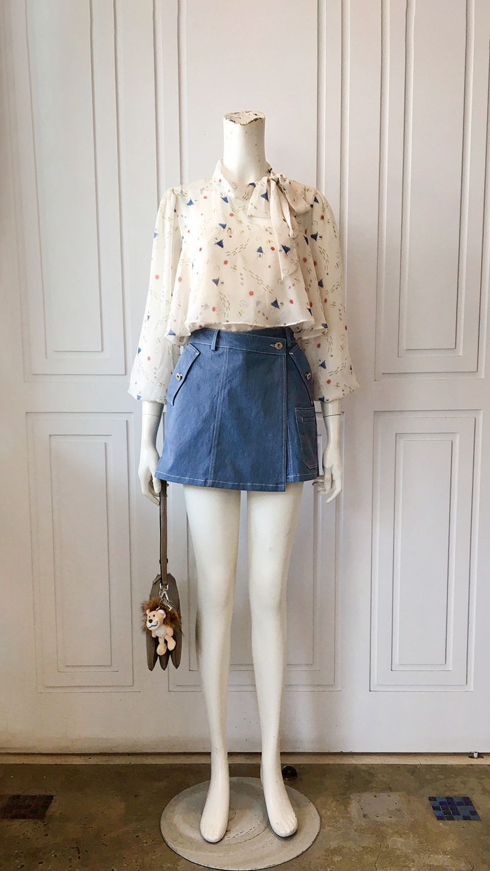 (衣) 插圖層次領結衣 / (褲) 斜片釦短褲
