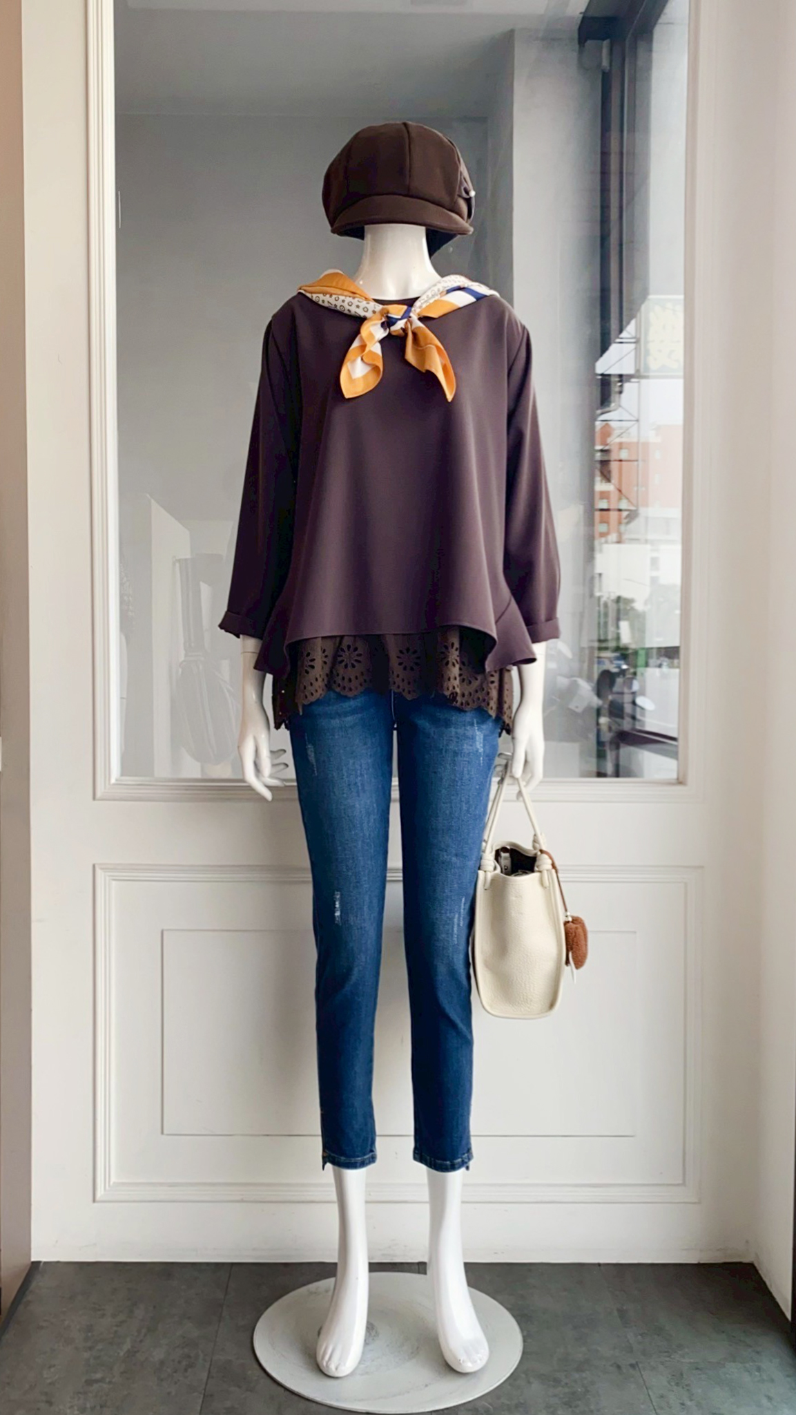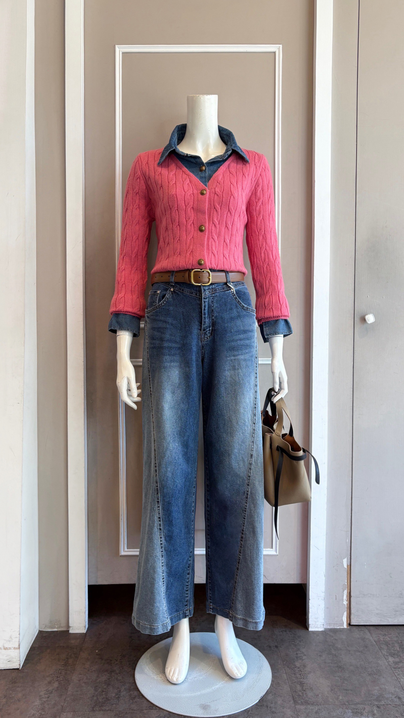 (衣) 牛仔領針衣 / (褲) 拼接牛寬褲