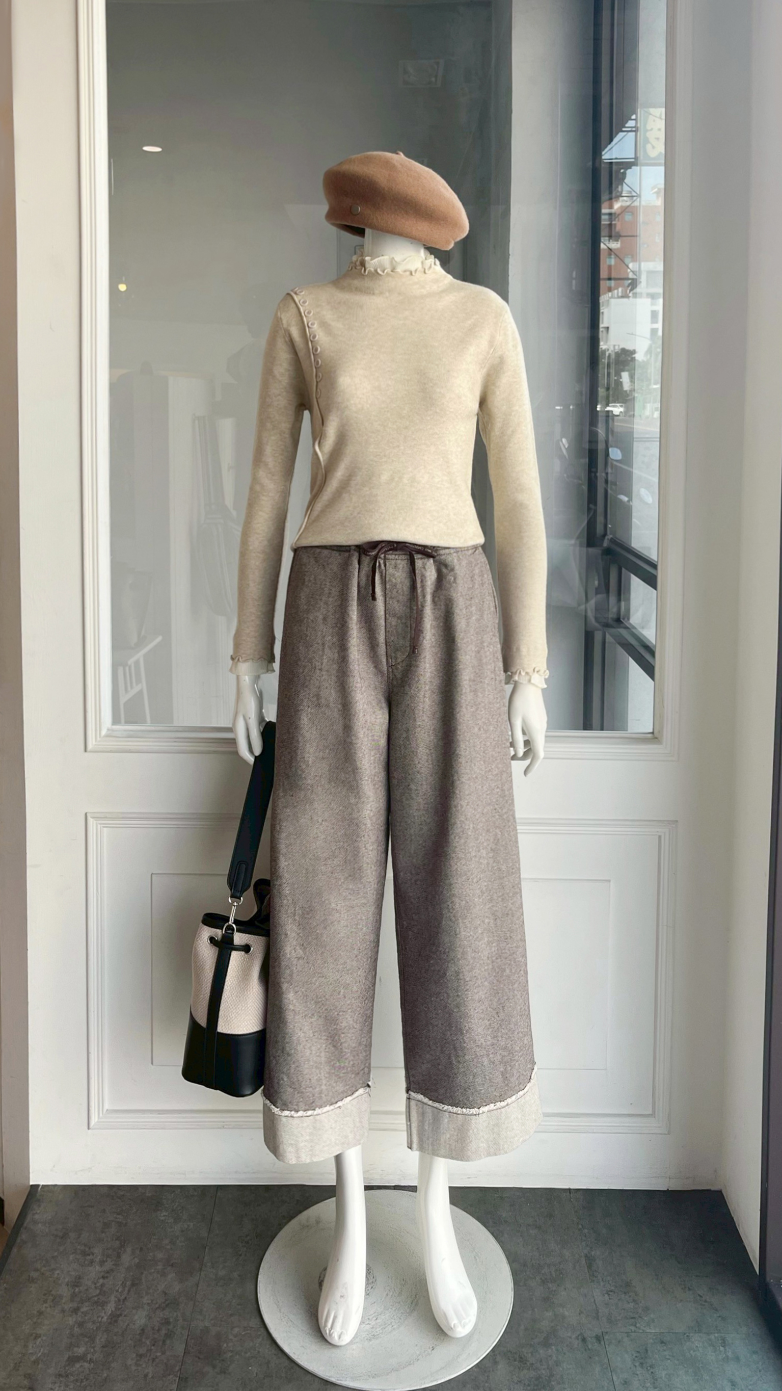 (衣) 木耳領斜釦衣 / (褲) 配色褲角寬褲