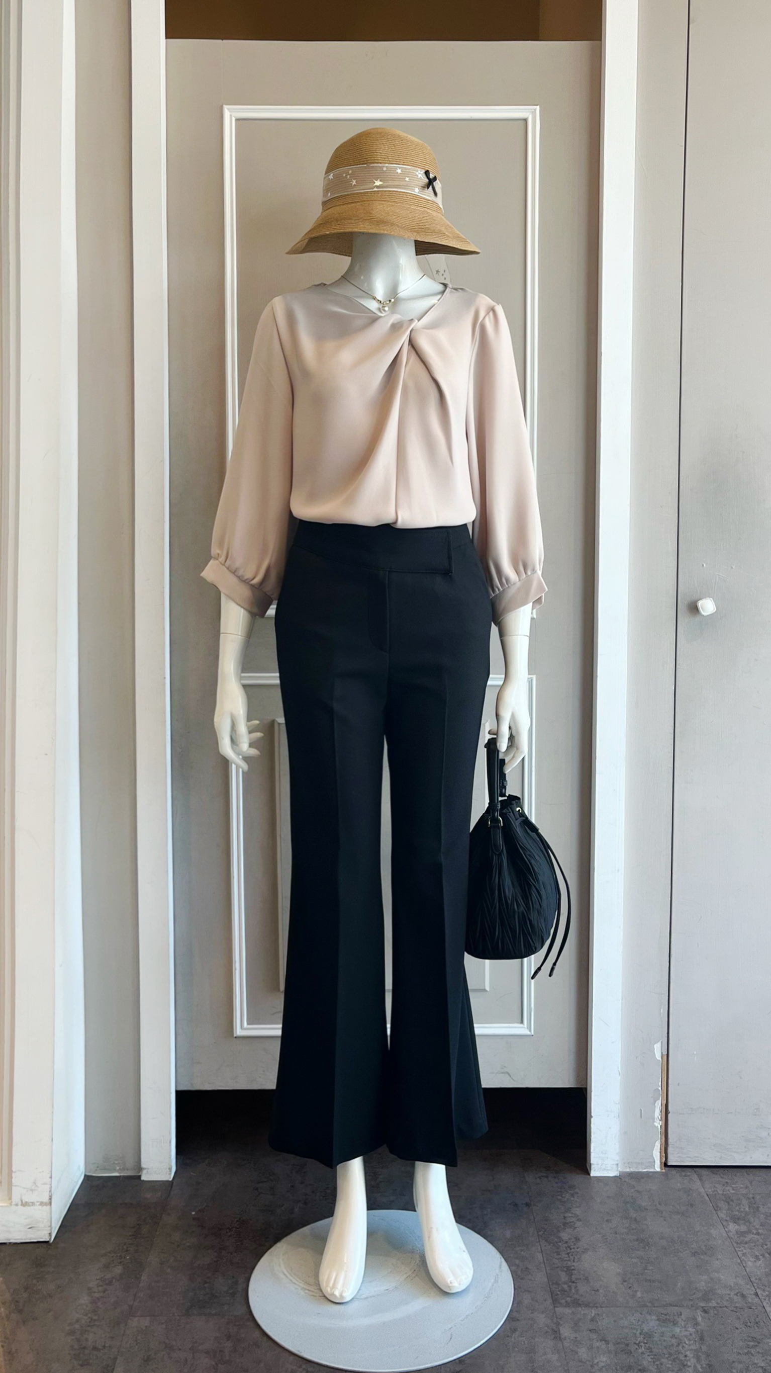 (衣) 扭結領雪紡衣 / (褲) 勾釦西裝喇叭褲