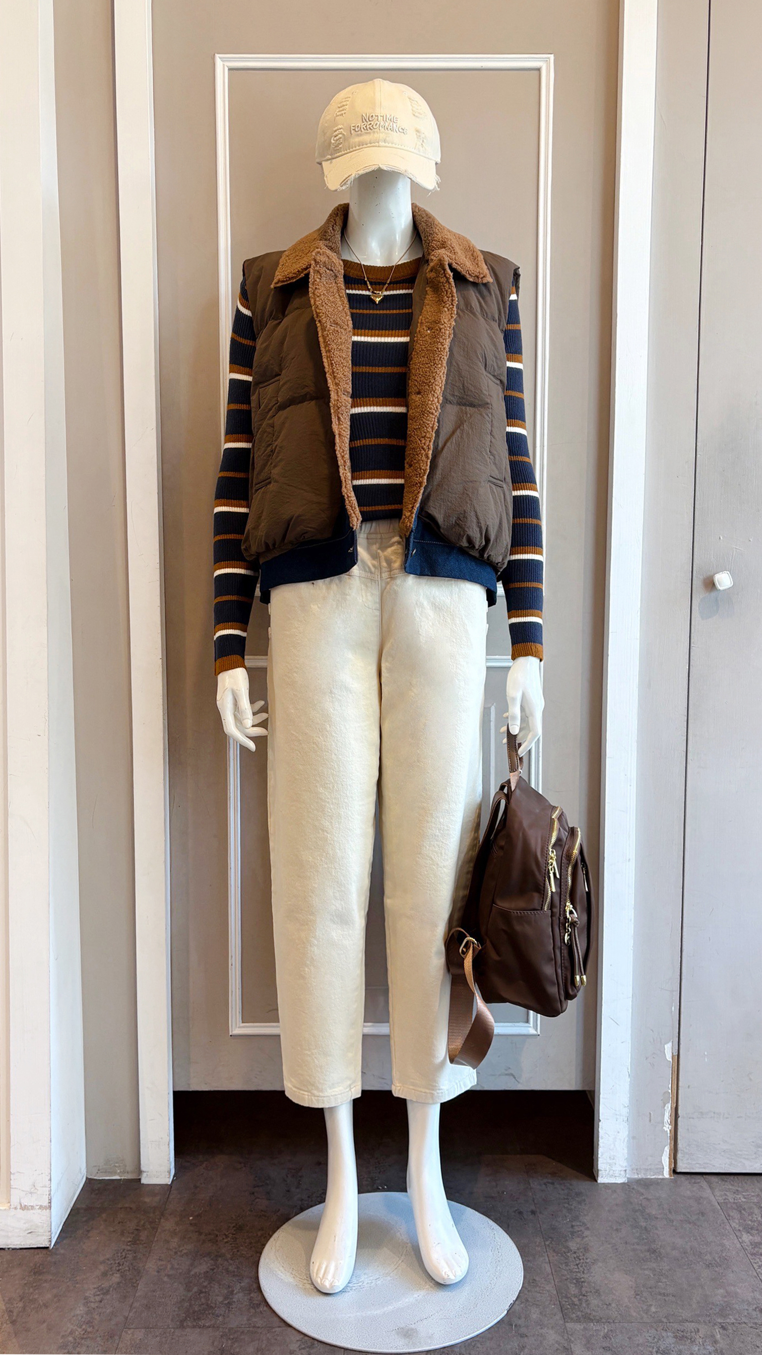 (衣) 三色橫條針衣 / (背) 羊羔毛領撞色背心