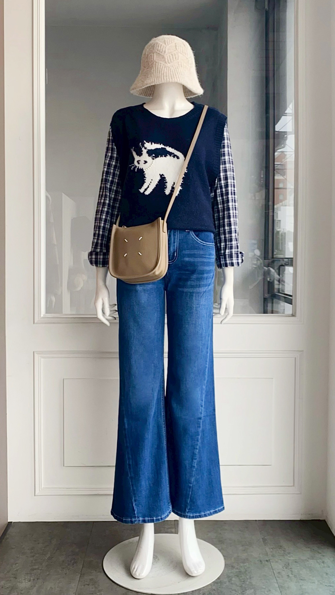 (衣) 格袖貓圖衣 / (褲) S1387723