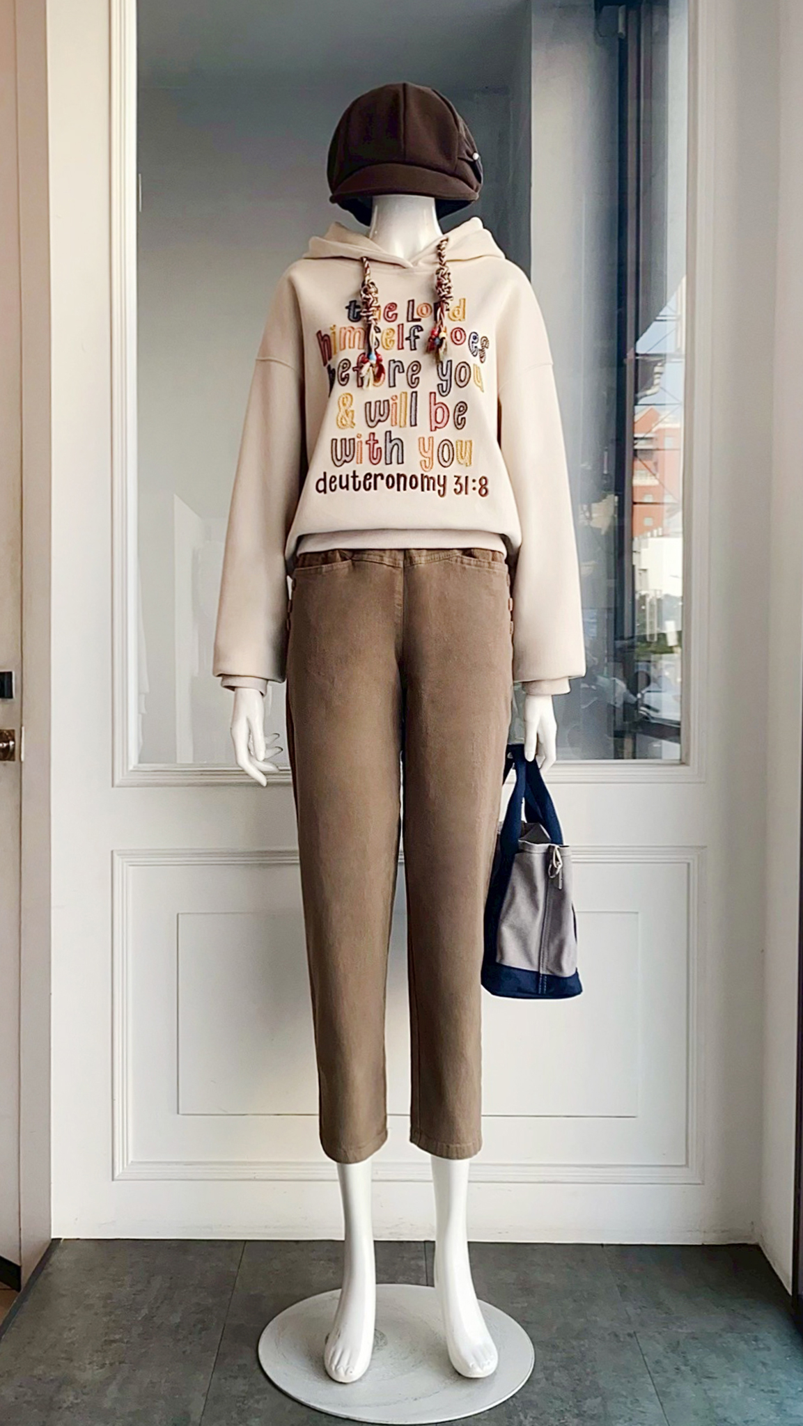 (衣) 英字麻花繩帽T / (褲) 側壓釦休閒褲