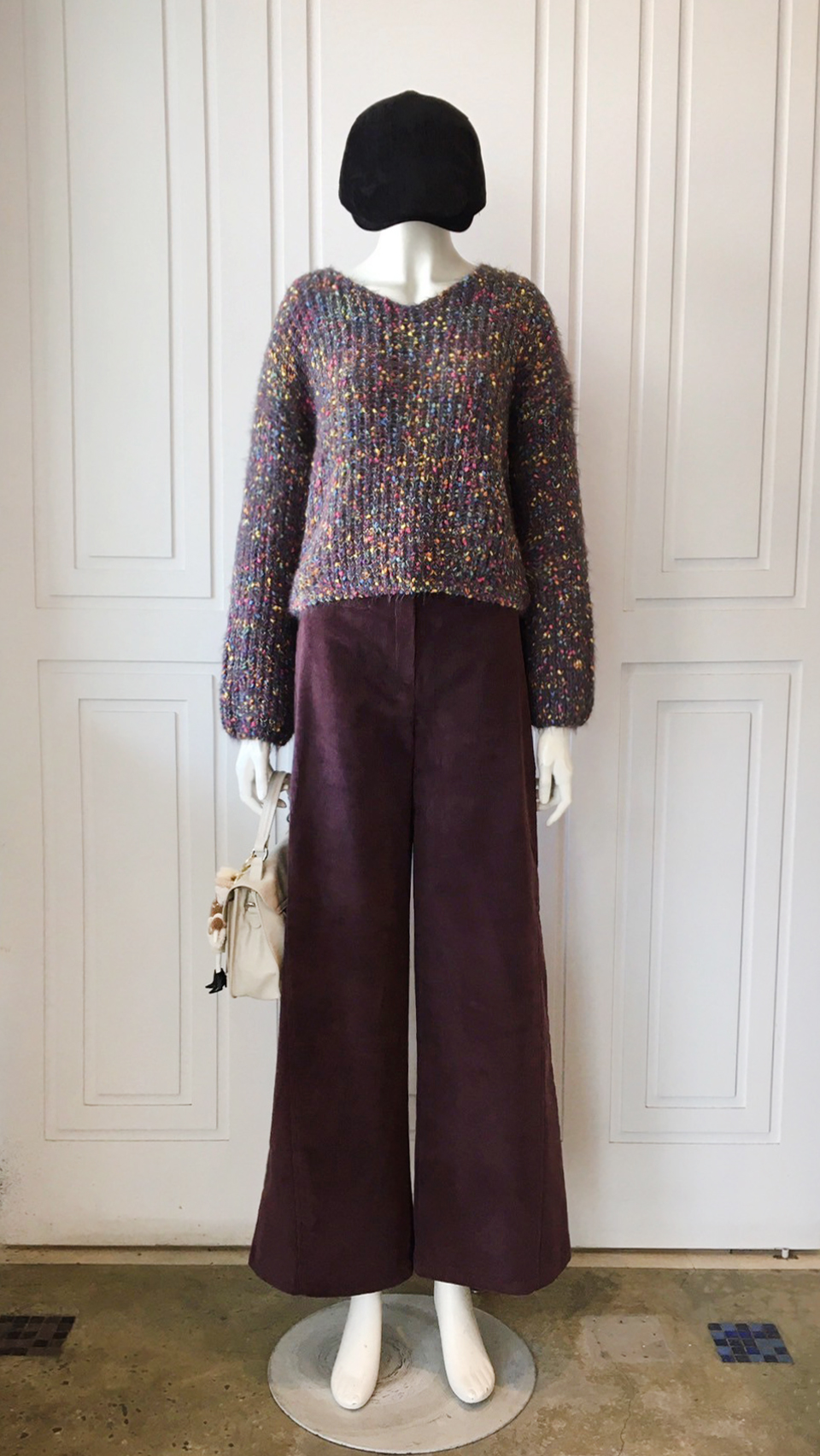 (衣) 彩色混織針衣 / (褲) 側剪接寬褲