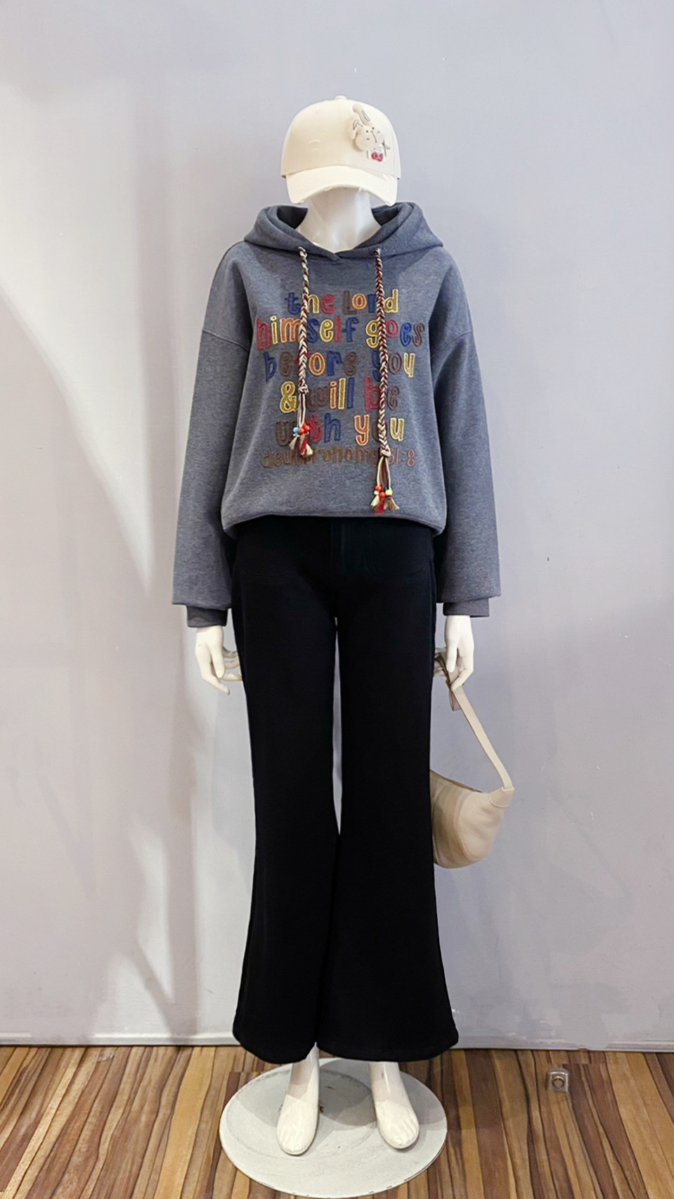 (衣) 英字麻花繩帽T / (褲) 雙釦修身喇叭褲